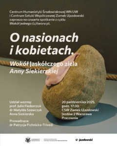 Spotkanie O nasionach i kobietach. Wokół „Jaskółczego ziela” Anny Siekierskiej odbędzie się 20 października 2025 r. o godzinie 17:30 w Centrum Sztuki Współczesnej Zamek Ujazdowski (ul. Jazdów 2, Warszawa), w sali Pracownia.